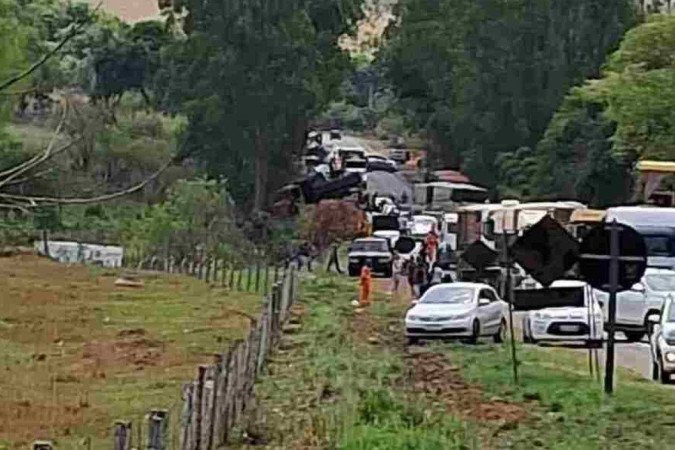 No local, de acordo com os Bombeiros, há um caminhão caçamba vazio que registra vazamento de combustível. Há, também, dois graneleiros bitrem carregados, sem identificação clara.