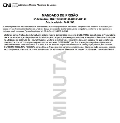 No sistema oficial do Conselho Nacional de Justiça (CNJ), consta que Alexandre de Moraes determinou a prisão de si mesmo. O documento foi colocado na página, no segmento destinado a mandados de prisão, na noite desta quarta-feira (4/1). A “síntese da decisão” é repleta de ironias à atuação do ministro do STF, evidenciando um provável ataque hacker.