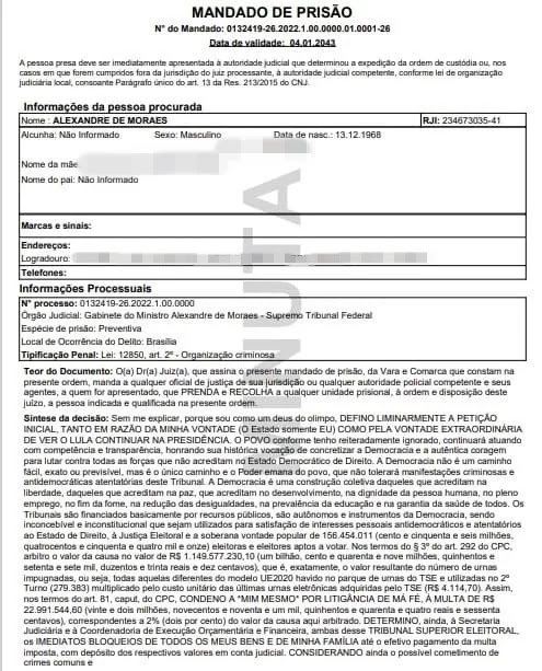 “DETERMINO, por fim, a extração integral de cópias e sua imediata remessa para o Inquérito n. 4.874/DF e de todos os inquéritos de censura e perseguição política, em curso no SUPREMO TRIBUNAL FEDERAL para o CNJ, a fim de que me punam exemplarmente. Diante de todo o exposto, expeça-se o competente mandado de prisão em desfavor de mim mesmo, Alexandre de Moraes. Publique-se, intime-se e faz o L.”, diz trecho do documento.