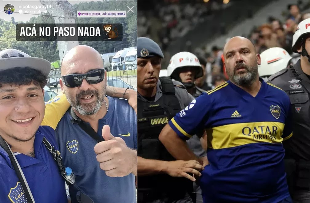 Torcedor preso em Itaquera e solto após pagar fiança posou para foto ao lado de outro argentino com a frase “aqui não houve nada”, seguida de emoji de macaco. Titular da Delegacia de Polícia de Repressão e Análise aos Delitos de Intolerância Esportiva (Drade) diz que vai acionar Instagram, Conmebol e torcida do Boca Juniors para tentar identificar quem postou imagem.