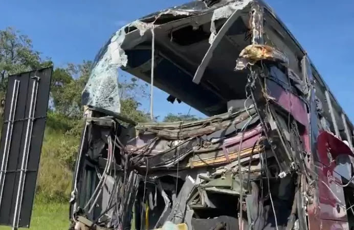 O veículo colidiu na traseira de um caminhão carregado de madeiras. As toras teriam atingido a parte da frente do ônibus.