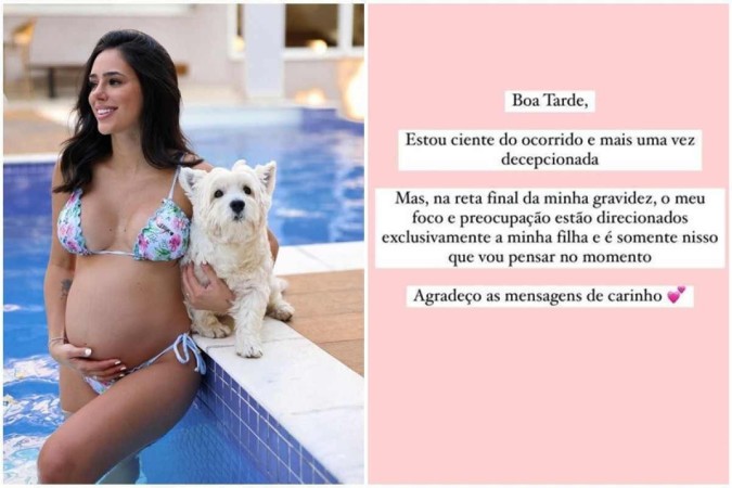 “Mas, na reta final da minha gravidez, o meu foco e preocupação estão direcionados exclusivamente a minha filha e é somente nisso que vou pensar no momento”, afirmou ela. No final da publicação, ela agradeceu as mensagens que recebeu. “Agradeço as mensagens de carinho”, declarou.