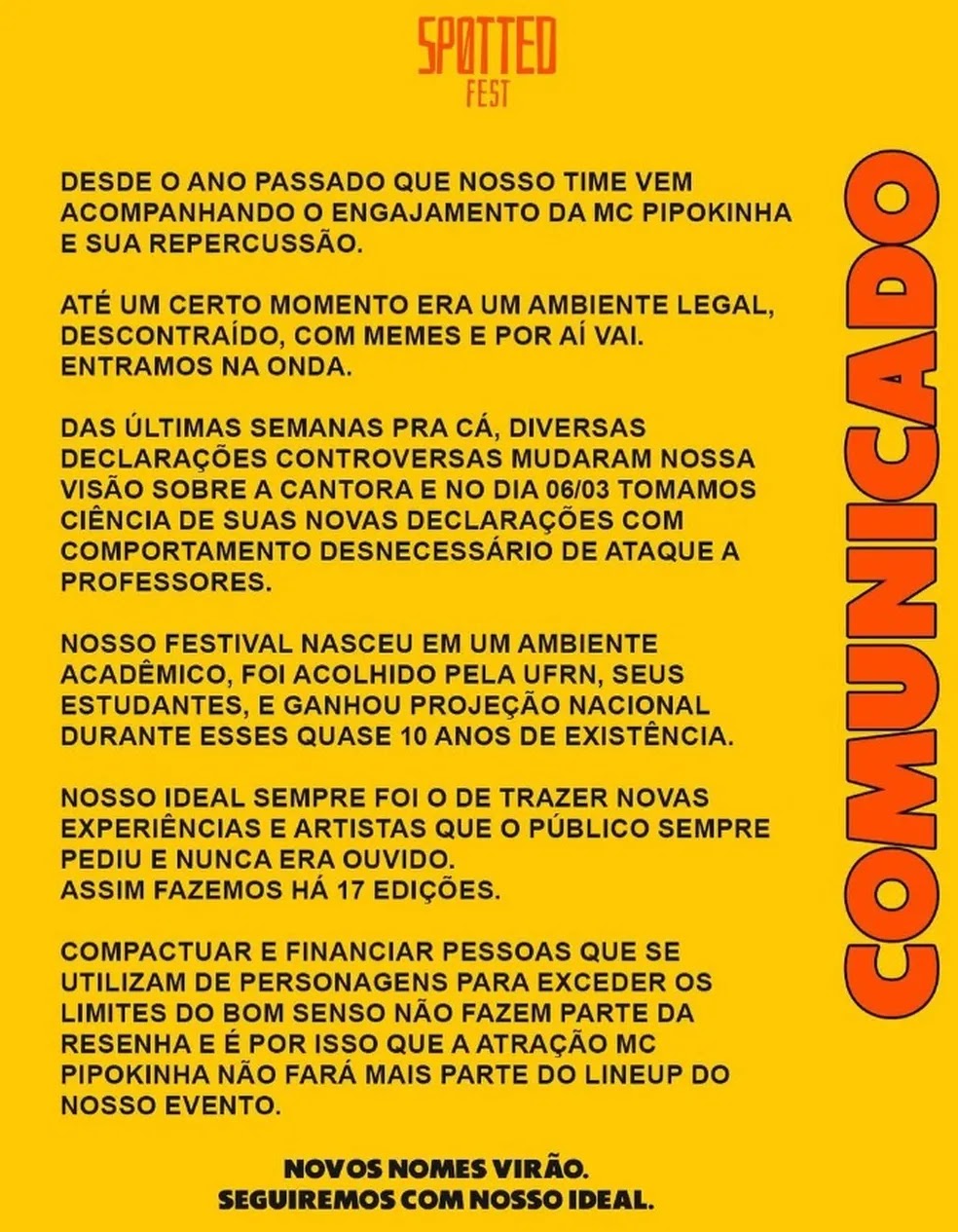 Ao justificar o cancelamento, o Spotted Festival lembrou que o evento começou no ambiente acadêmico, na Universidade Federal do Rio Grande do Norte (UFRN), e tendo universitários como público-alvo.