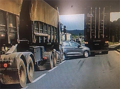 Um carro ficou prensado entre dois caminhões em um acidente na manhã da última sexta-feira (20/5), no Contorno Leste, região metropolitana de Curitiba.