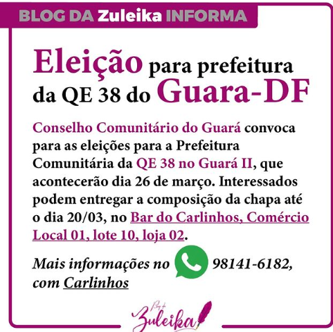 O Conselho comunitário do Guará convocou as eleições da prefeitura comunitária da QE 38 do Guará II para o dia 26 de março de 2023.