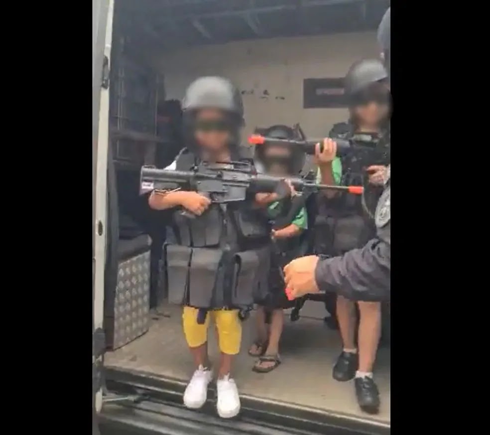 Em seguida, ele abre a porta da viatura e as crianças aparecem com parte do uniforme original da PM e as réplicas das armas nas mãos. Ao som da sirene, elas saem do carro e recebem “instruções” dos militares que estão ao lado de fora.