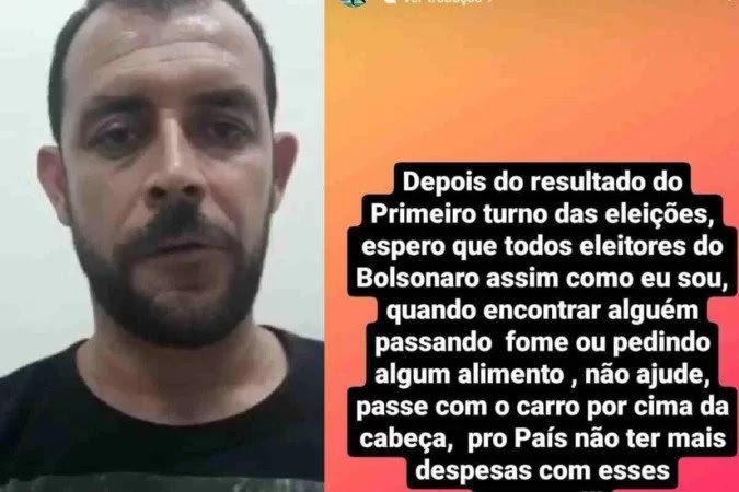 “Depois do resultado do primeiro turno das eleições, espero que todos eleitores do Bolsonaro, assim como eu, quando encontrar alguém passando fome ou pedindo algum alimento, não ajude. Passe com o carro por cima da cabeça pro País não ter mais despesas com esses vermes”, escreveu o atleta.