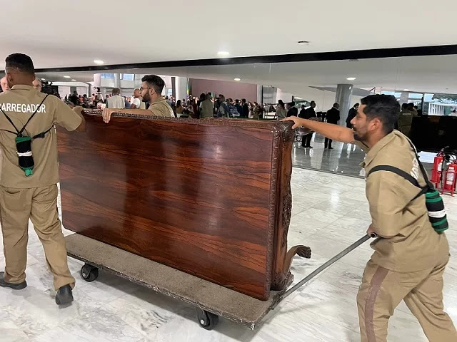 Funcionários do Palácio do Planalto também retiraram o tapete sob o qual ficava a mesa principal de trabalho de Bolsonaro, para que o piso do gabinete presidencial fosse limpo.