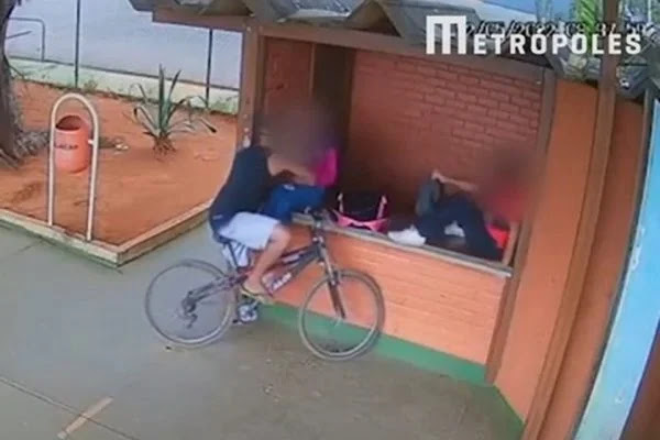 Nas imagens, é possível ver que, às 8h37, o homem passa de bicicleta em frente à unidade de ensino, olhando para dentro da escola. Ele retorna e entra na instituição. No local, duas meninas aparecem sentadas em um muro. O homem passa por elas e, segundos depois, volta para abordá-las.