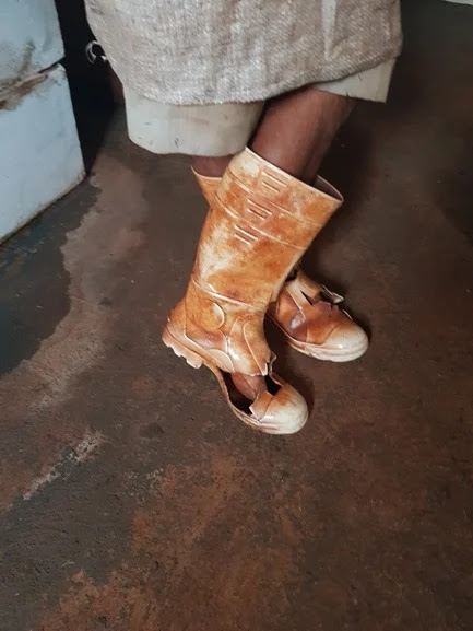 O alojamento era composto por uma cama, o vaso sanitário, um tanque para lavar e o varal para secar roupas, tudo em um mesmo cômodo apertado e pouco arejado. Os equipamentos de trabalho também estavam em péssimas condições, como exemplificam essas botas: