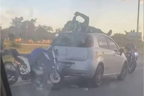 Um motociclista parou em cima de um veículo após bater na traseira do carro, na manhã desta sexta-feira (22/4), na Estrada Parque Indústria e Abastecimento (Epia Sul).