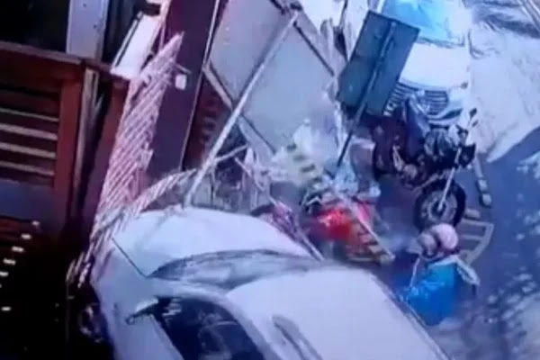 Imagens de câmera de segurança de um condomínio registraram o exato momento em que a mulher quase é atingida pelo veículo em Goiás