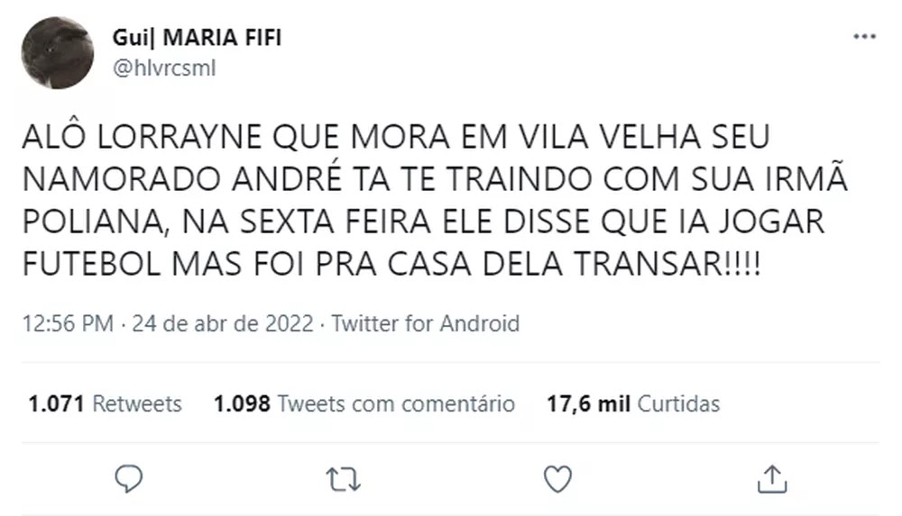 O relato do jovem Guilherme Lemos no Twitter viralizou e chegou até os envolvidos, desencadeando o término do casal.