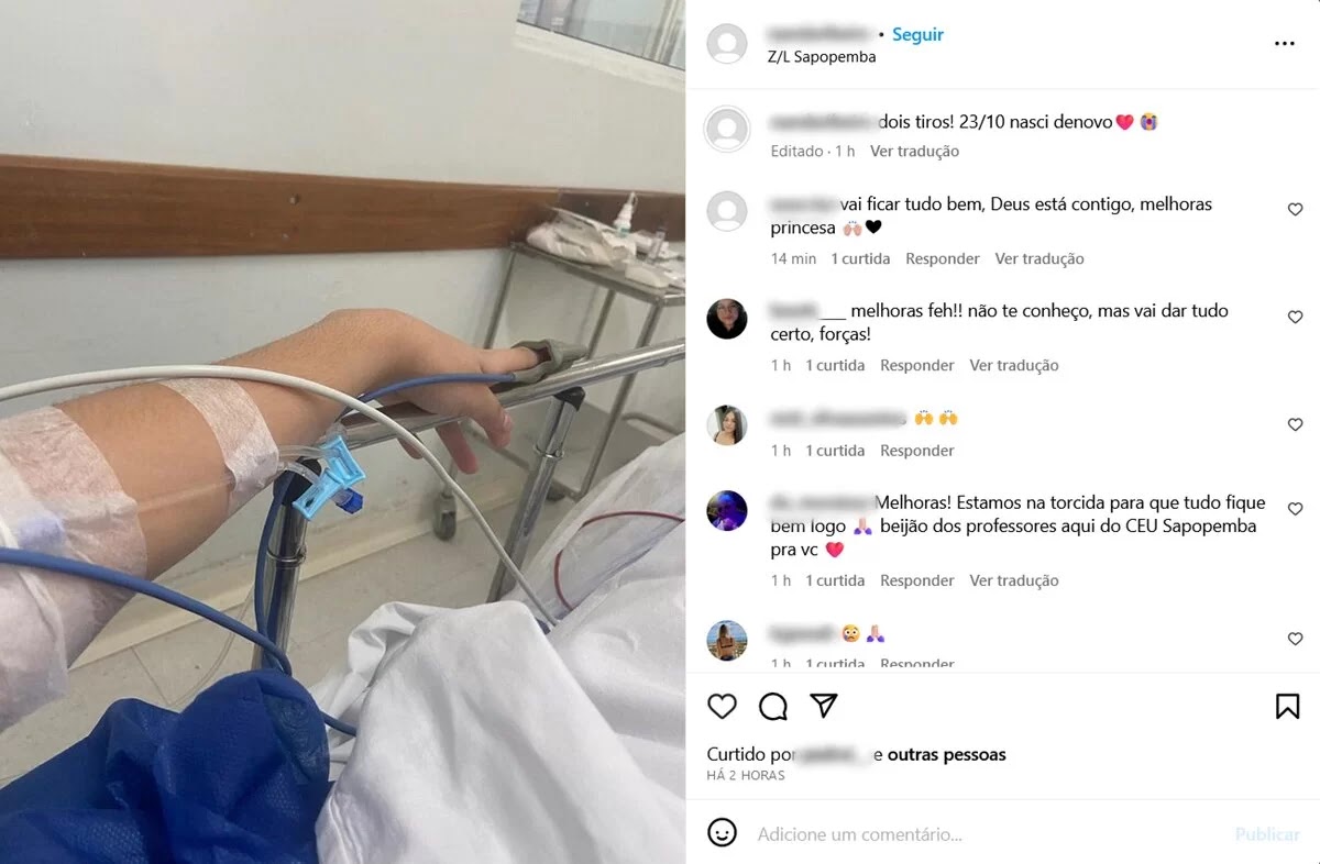 Uma das vítimas feridas a tiros durante um atentado, na manhã desta segunda-feira (23/10), em uma escola da zona leste paulistana, afirmou em uma postagem na internet ter sido ferida por dois disparos. “Nasci de novo”, escreveu a adolescente de 15 anos, cuja frase figura como legenda em sua foto na maca de um hospital (imagem em destaque).