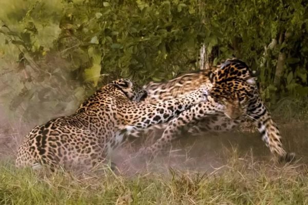 Uma tentativa de acasalamento acabou em briga entre duas onças-pintadas, no Pantanal. O momento raro foi registrado pelo biólogo Bruno Sartori Reis no Refúgio Ecológico Caiman, localizado em Miranda (MS), a 207 quilômetros da capital Campo Grande.