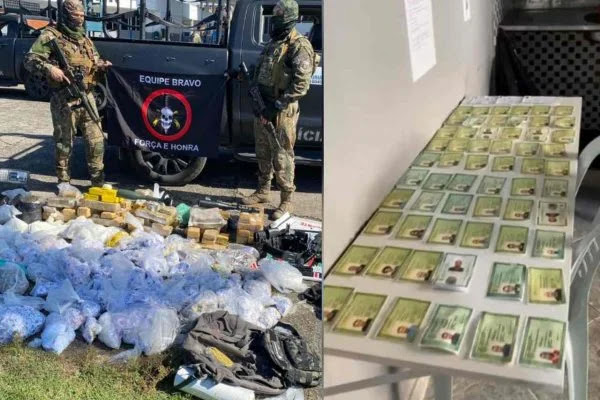 Na ação, foram apreendidas 70 identidades falsas, máquinas para transações financeiras com cartões, pastas com informações de cadastros pessoais. Também foram encontrados mais de 50 kgs de entorpecentes, pistolas, capas de coletes balísticos e 13 carros e cinco motocicletas roubados.