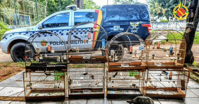 Durante a fiscalização, os policiais identificaram dois homens mantendo em cativeiro, de forma irregular, oito aves silvestres e um jabuti. A conduta configura infração prevista na Lei de Crimes Ambientais (Lei nº 9.605/98).