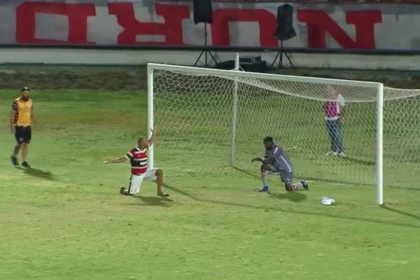 O torcedor correu para a área e ficou dando saltos em frente ao goleiro coral, que assistiu ao “show” do torcedor. Veja a cena inusitada.