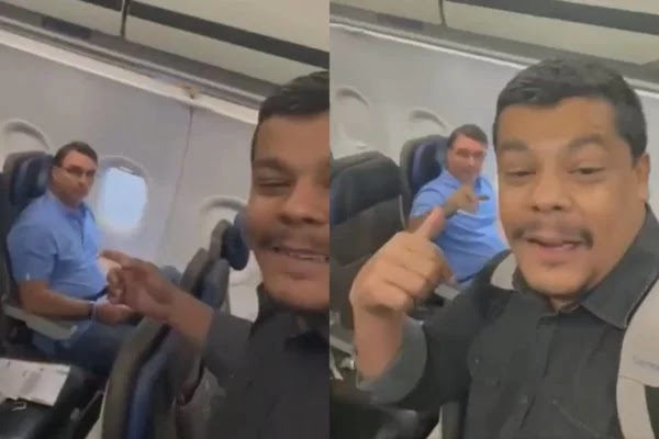 “Olha só quem eu encontrei aqui no avião, galera: Flávio Rachadinha. Tá gostando da picanha barata?”, aborda o passageiro. O senador foi investigado por suspeita de enriquecimento ilícito ao se apropriar do salário de funcionários do gabinete dele na Assembleia Legislativa do Rio de Janeiro (Alerj), no período em que era deputado estadual.